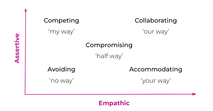 We each find ways to cope with conflict depending on how assertive we feel about getting our own needs met, or empathic to other people’s preferences. You can probably recall moments when you’ve chosen to avoid someone, accommodate their way of doing things and set your preferences aside, competed to have it your way, or chosen to settle for a compromise.